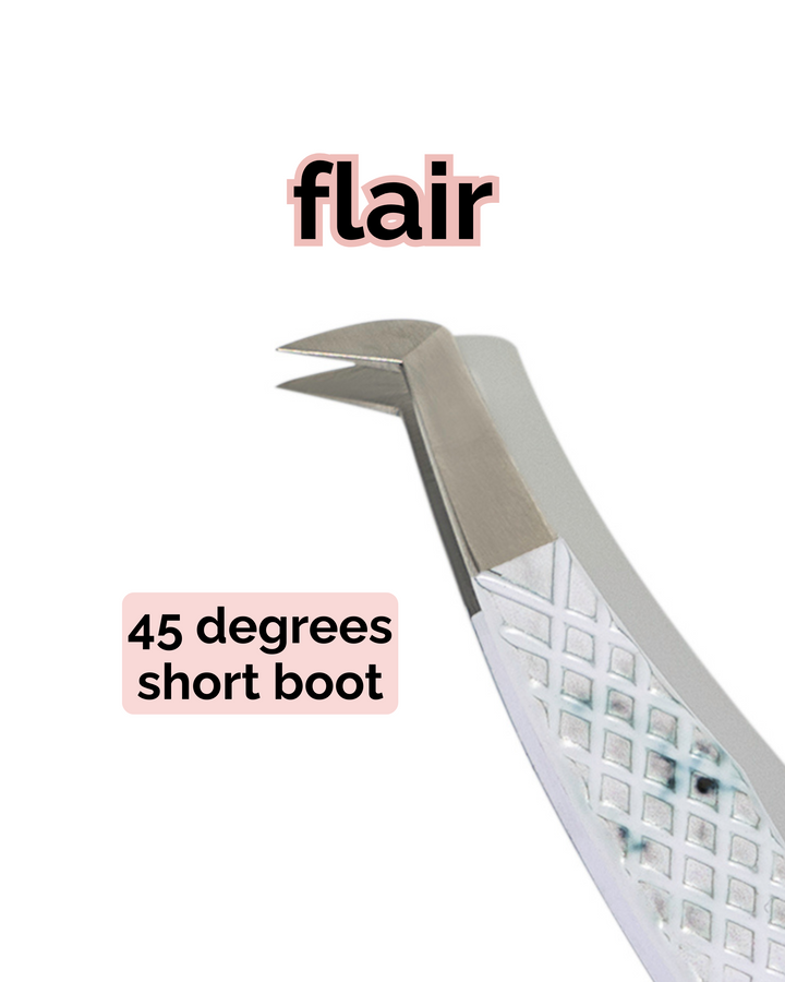 This 45-degree boot-shaped tweezer is perfect for both classic and volume lash application, making it an essential tool in your lash tweezer set. Elevate your lash artistry with the Flair Lash Tweezer, crafted for lash artists who demand precision and performance. Designed for boot tweezer enthusiasts, it offers unparalleled grip and versatility for all lash diameters and techniques.
